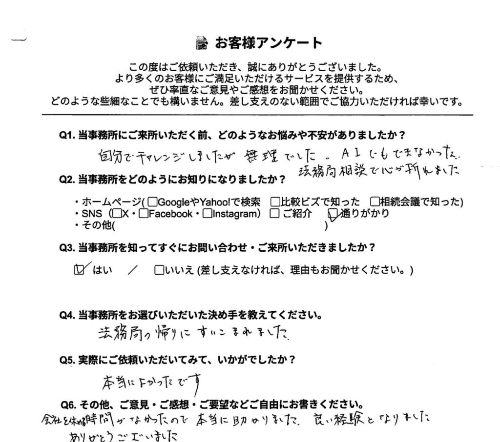 こちらのページでは、弊所にご依頼をいただきましたお客様の声をご紹介させていただいております。